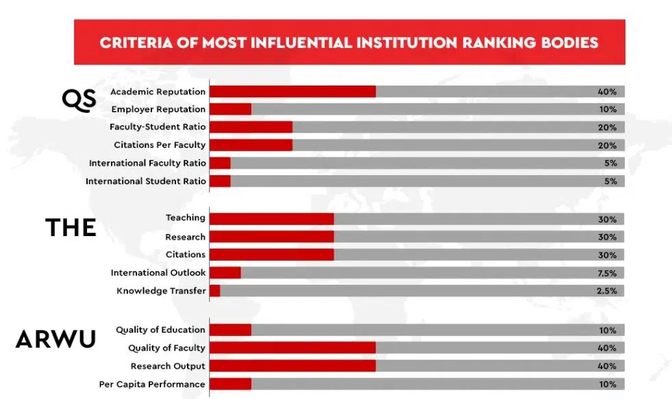 The most influential institution ranking bodies are Quacquarelli Symonds (QS), Times Higher Education (THE), and the Academic Ranking of World Universities (ARWU). The figure below shows how these ranking bodies use different criteria in ranking global institutions. I hope this gives an insight into how most ranking bodies makes the rankings.