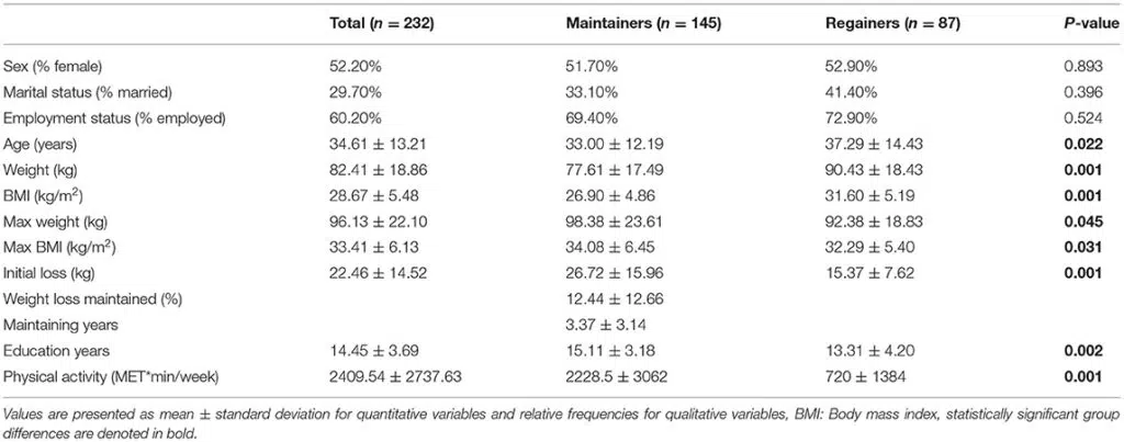 Results: There were 225 participants in this study, 145 who maintained their weight and 87 who regained it. The total sample (the regainers and maintainers groups) had an equal number of men and women (p = 0.893) (Table 1 ). The regainers tended to be older and less educated, while the maintainers tended to be younger and more educated. The BMI and weight of maintainers were lower. Still, their maximum weight, maximum BMI ever reached, and initial weight loss was significantly more significant than regainers (p < 0.05 for all). A mean weight loss of 12.5% was reported in the maintainers’ group for almost 3.5 years. Regarding physical activity, maintainers reported significantly higher physical activity levels than regainers (p < 0.001).