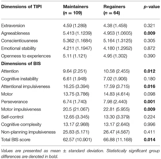The differences between groups across the TIPI questionnaire’s five personality dimensions and the BIS scale are reported in Table 2. Only the agreeableness dimension showed a statistical difference from the other four. Maintainers were more agreeable than regainers (p = 0.009). However, comparing the BIS results reveals regainers scored significantly higher on attention (p = 0.012) than maintainers (p = 0.016). A significant difference between the two groups (p < 0.05) was also observed on perseverance and motor impulsiveness, as well as on the total BIS score, with higher scores in the regainers relative to the maintainers (Table 2). The association between analysis agreeableness and weight loss maintenance remained statistically significant following further adjustments and logistic regression. In addition, other adjustments were performed for multiple groups, and they were inversely associated with weight loss maintenance.