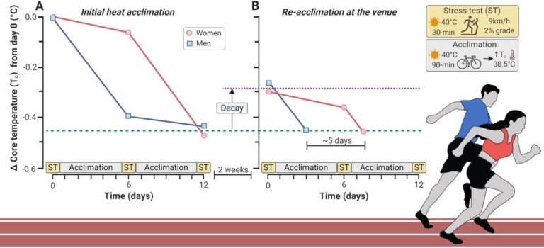 During heat-exertion, athletes’ core temperatures can reach above 41°C (Racinais et al., 2019). Most of the information includes special considerations for Football (Nybo et al. 2020) and an analysis of 8530 elite beach volleyball matches (Racinais et al. 2000), revealing the risks associated with playing in the heat when not accustomed to it. In addition, the editorial from Notley et al. (2020) (which features the figure below) challenges the notion that men and women have different thermoregulatory strategies, as all humans are challenged by acute heat exposure but can adapt regardless of gender.![heat1[1]](https://hercme.com/wp-content/uploads/2023/10/heat11.jpg)