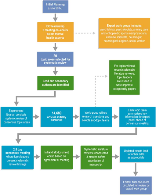 The following sections describe how a meeting was planned and prepared, how it was conducted, and how the consensus statement was written. To generate a consensus statement, the organizing group identified 20 topic areas (Figure 1). With scientific expertise and clinical expertise, an author (or authors) was assigned to each study as the lead author and sometimes as a secondary author. A librarian conducted systematic reviews of each topic area using databases such as PubMed, SportDiscus, PsycINFO, Scopus, Cochrane, and other databases relevant to each topic by area leaders. Study designs of all types were included in the search, and only English was used in the search. An initial search strategy was developed with input from the expert panel to capture all relevant search terms. The librarian revised searches as needed. The expert panel screened 14689 published articles. A revised set of 20 research topic areas was developed based on the results and input of the expert panel. Due to the lack of a recently published systematic review, leading authorities were invited to write more detailed papers on their subject areas; these papers will be published separately. In the final step, the topic teams must summarize their key findings and present them to the expert panel before the consensus meeting. Before the meeting, a draft of these summaries was circulated to all participants. Topic leaders presented their systematic review findings at the consensus meeting, which lasted 2.5 days. A group discussion followed each presentation, and meeting co-chairs recorded each comment.Drafting the consensus statementBased on the agreement at the meeting, the initial draft of the systematic review summary document was edited. During the drafting of the final document, key points agreed upon during the meeting were not changed. They Re-conducted the systematic literature reviews three months before the manuscript was submitted, using the same search strategies as originally employed. Topic leaders received updated search results, and edits were made accordingly. The finalized version of the edited manuscript was circulated to the full panel of expert reviewers for further editing.THE COMPLETE ARTICLE CAN BE READ AT THIS LINK